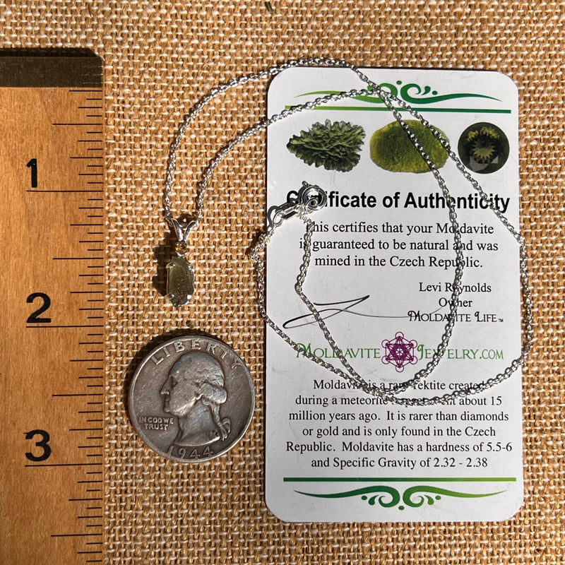 This silver raw Moldavite & faceted Citrine gem pendant with necklace is unique. The gemstones were set in sterling silver by an artist in our studio. All of our Moldavite is genuine, sourced from the Czech Republic, and comes with a Certificate of Authenticity. An 18 inch sterling silver rolo chain necklace is included.
